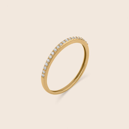 Classic yellow gold diamond band with four prong basket setting
