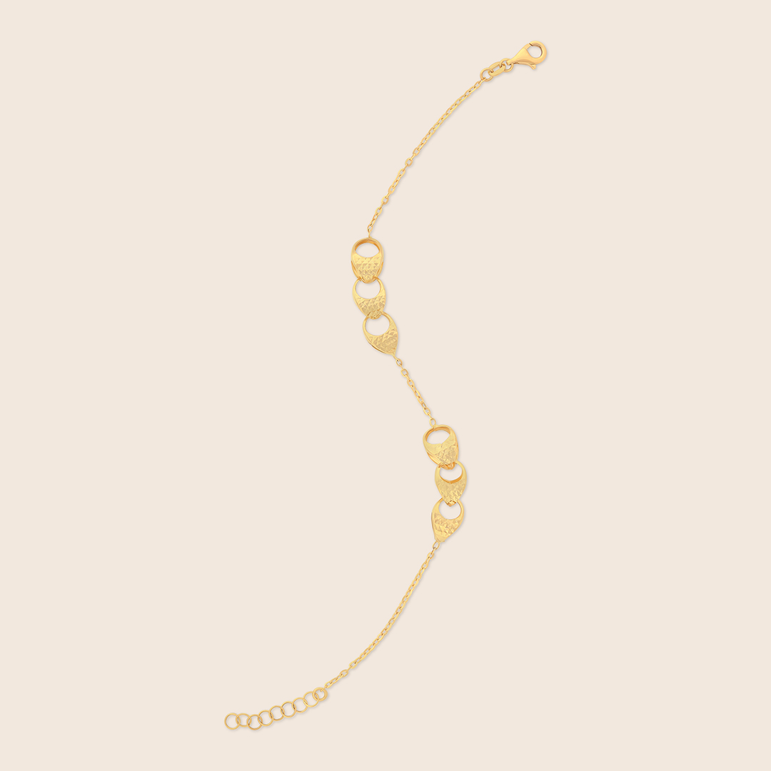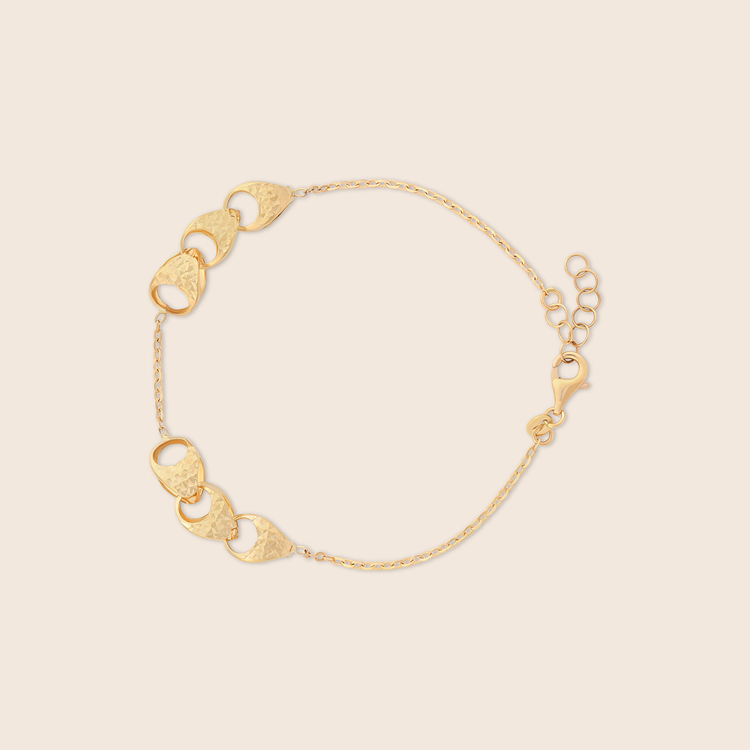 A bracelet of yellow gold is crafted, where trios of interlinked forms are placed on each side and joined by a golden chain, symbolizing harmony, balance, and an endless bond