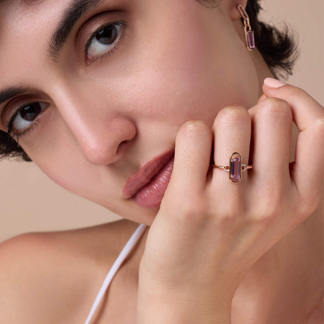 A radiant amethyst rests in rose gold, kissed by diamonds. symbolizing clarity, calm, and the quiet strength of refined femininity.