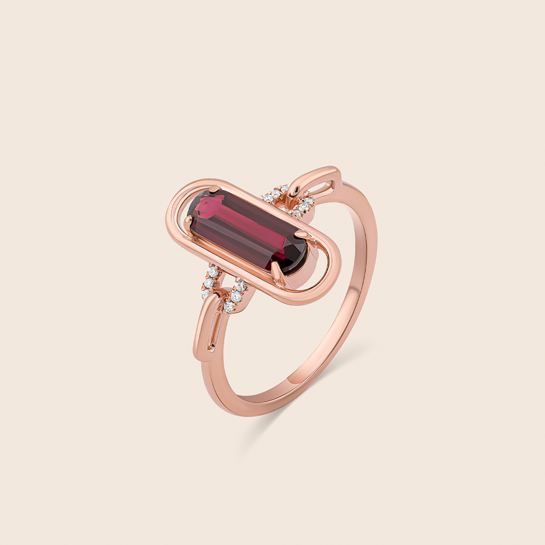 A vibrant garnet embraced by rose gold and sparkling diamonds, echoing passion, resilience, and the enduring beauty of confident elegance.