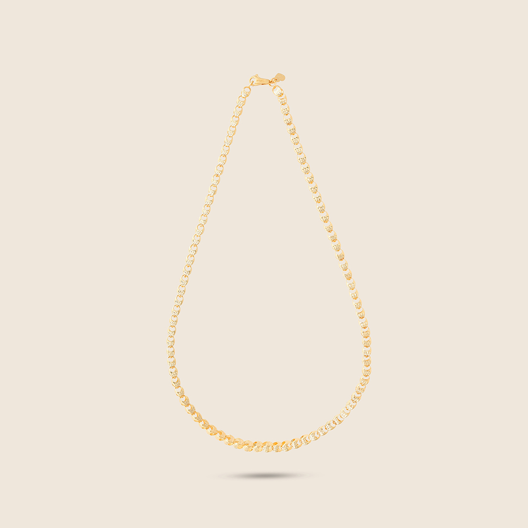 A necklace of wide interlinked yellow gold is crafted, with each bold link flowing in seamless connection and symbolizing strength, elegance, and the infinite beauty of unity