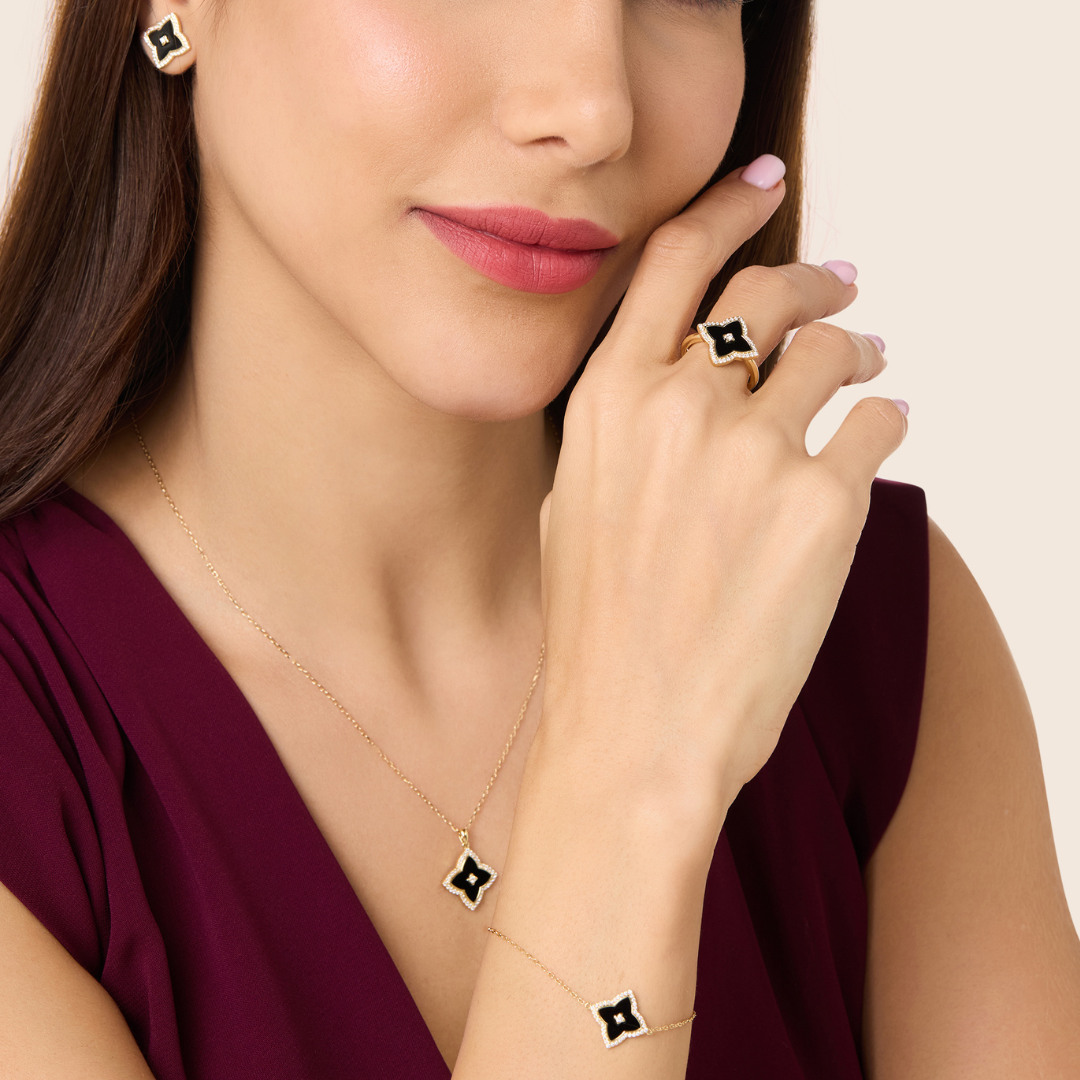 A black onyx flower edged in yellow gold, adorned with diamonds, an emblem of resilience, faith, and enduring inner strength