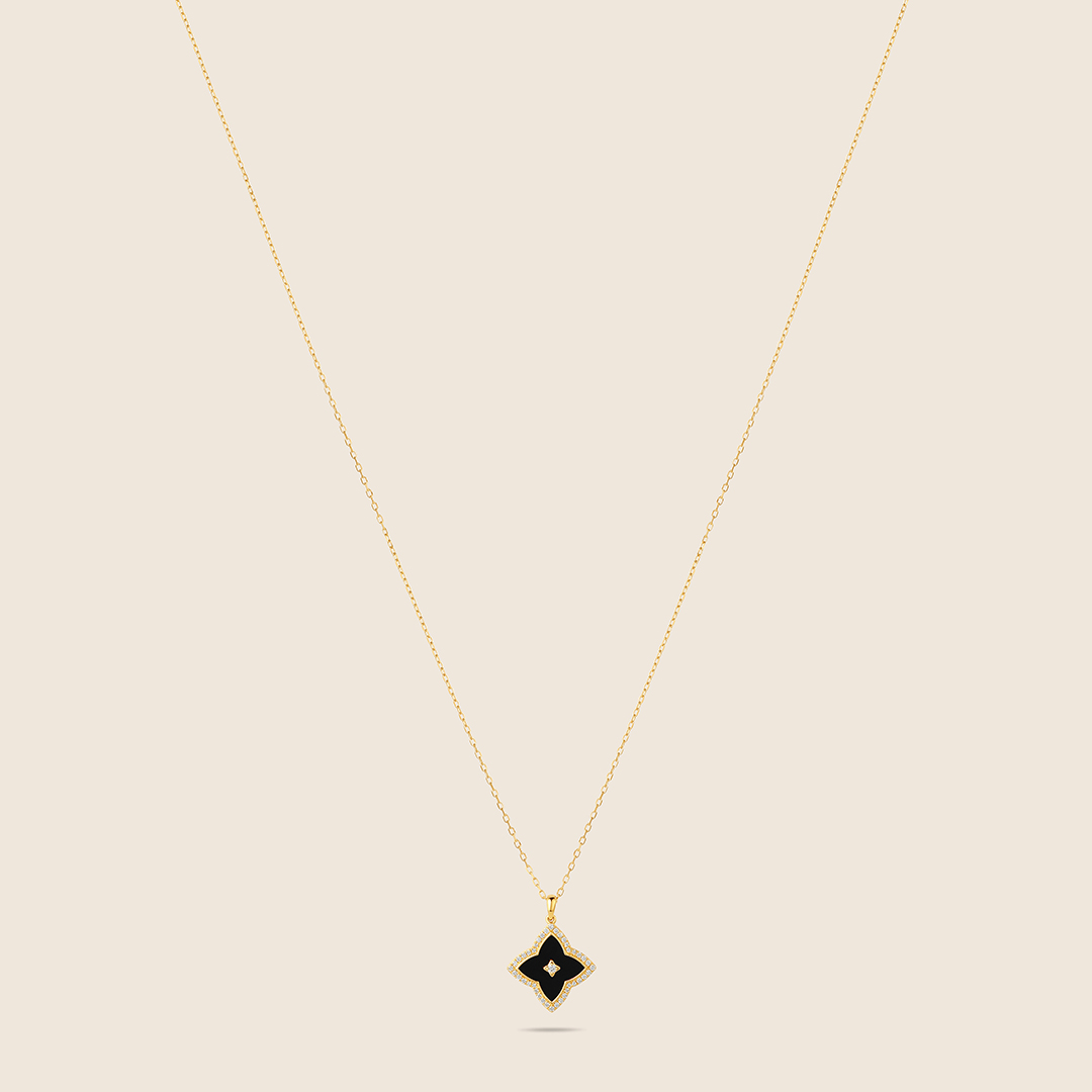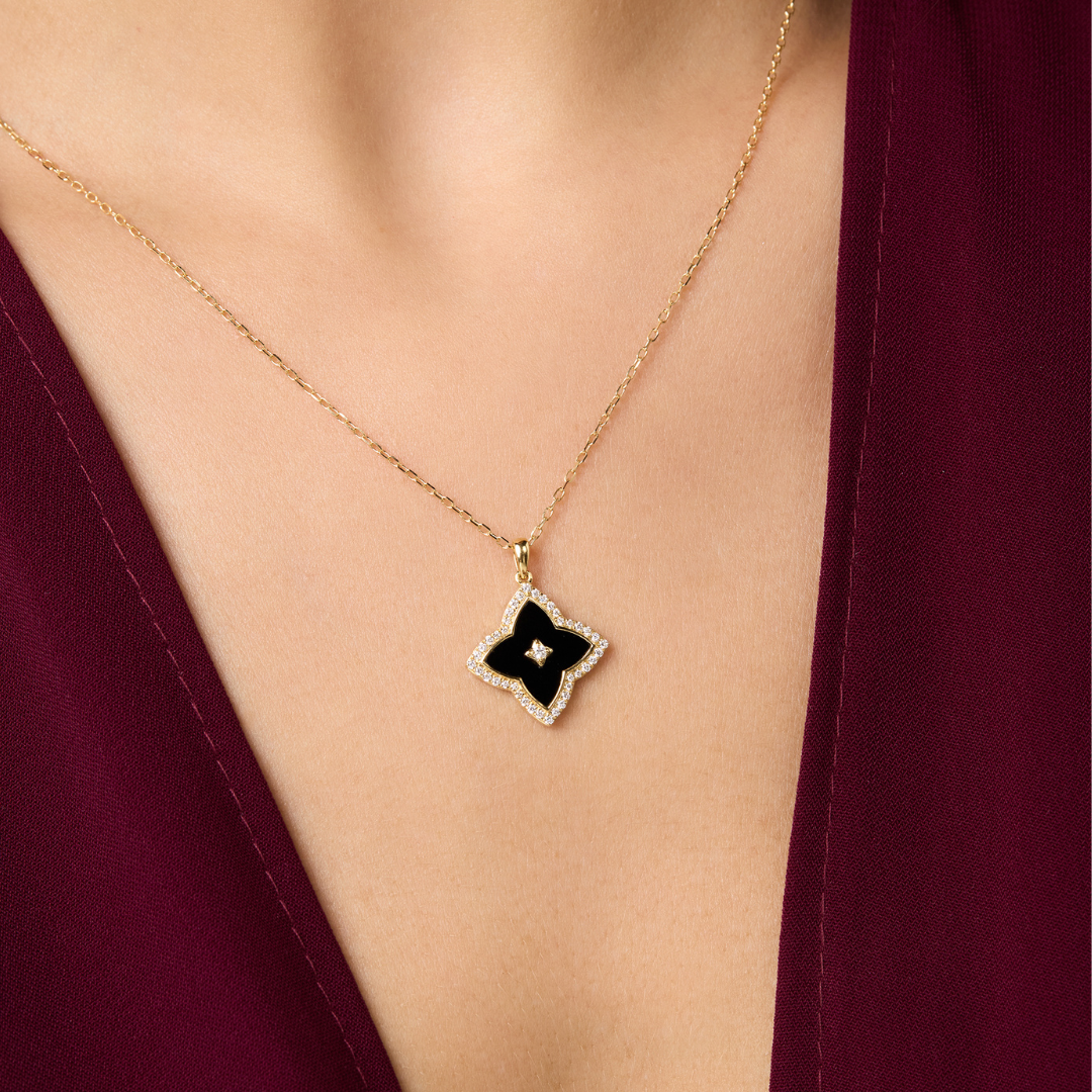 A black onyx flower edged in yellow gold, adorned with diamonds, an emblem of resilience, faith, and enduring inner strength