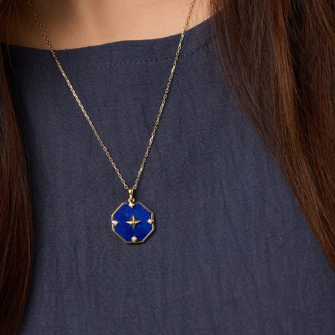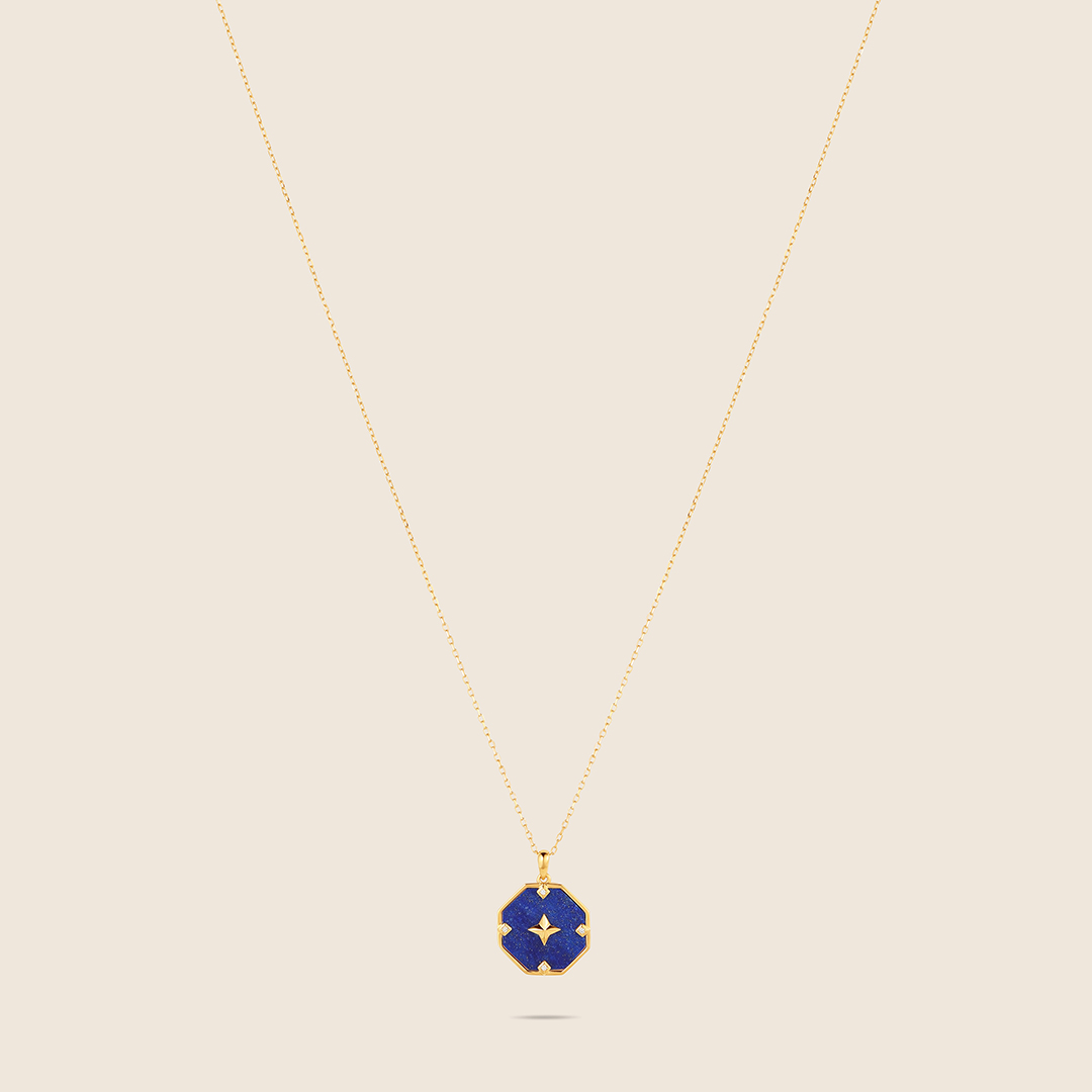 Be the first to review “Amara yellow gold diamond octagon pendant with lapis lazuli”