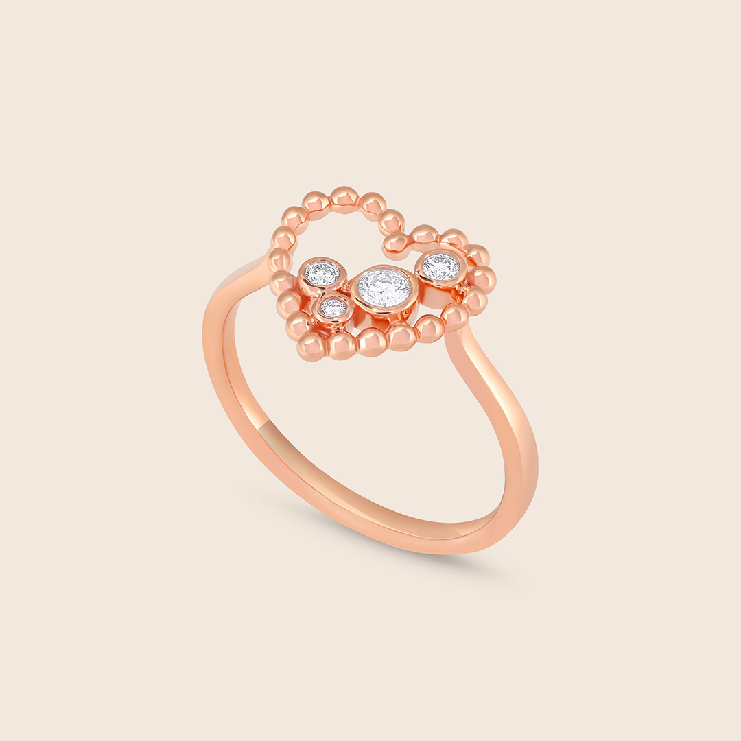 A heart of playful bubbles, rose gold orbs encircle diamonds that shimmer like captured laughter, eternalizing joy in every glimmer.