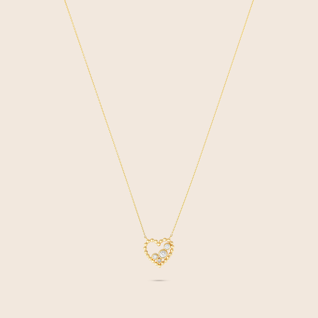 A heart of playful bubbles, yellow gold orbs encircle diamonds that shimmer like captured laughter, eternalizing joy in every glimmer.