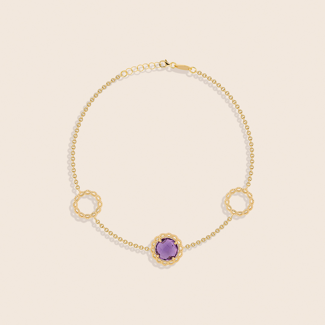 A single amethyst framed in gold, mirroring her soul pure, transparent, and gracefully resilient through every season of change