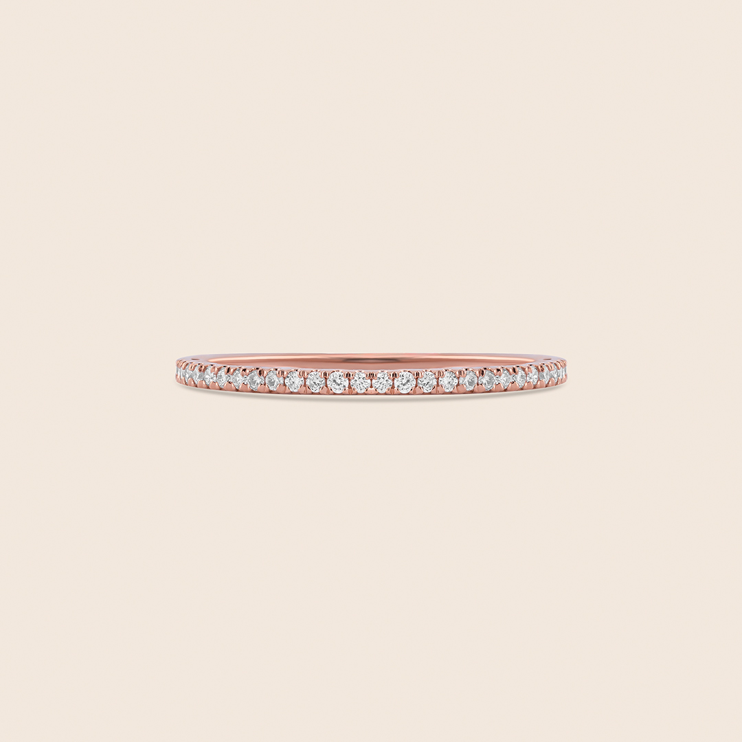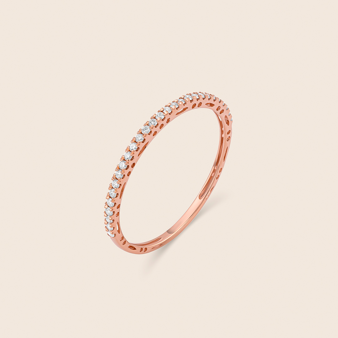 A rose gold band adorned with diamonds in a split prong setting timeless elegance where warmth meets brilliance