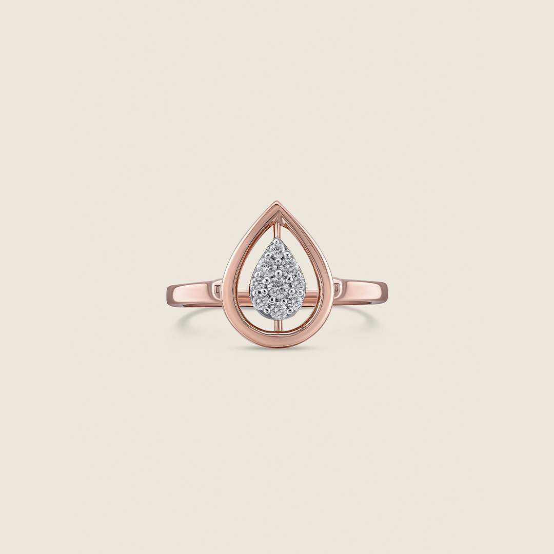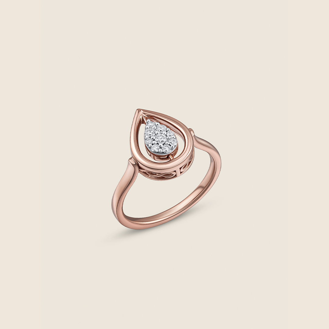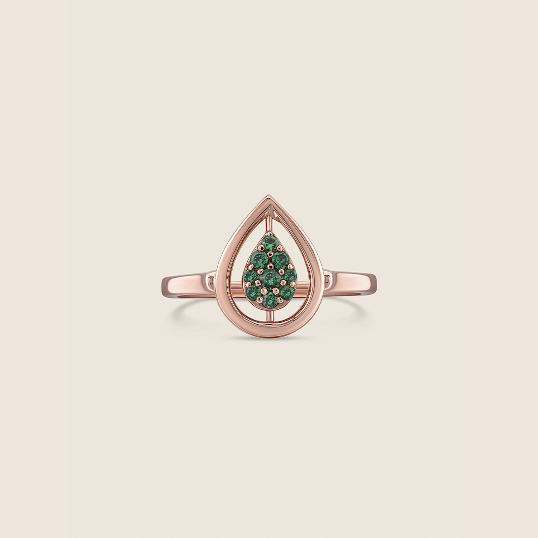 A rose gold ring holds a gentle drop, one side shimmering with diamonds, the other with emeralds. Ever-shifting, it reflects love?s many moods, capturing quiet moments and the soft sparkle of memories worn close.