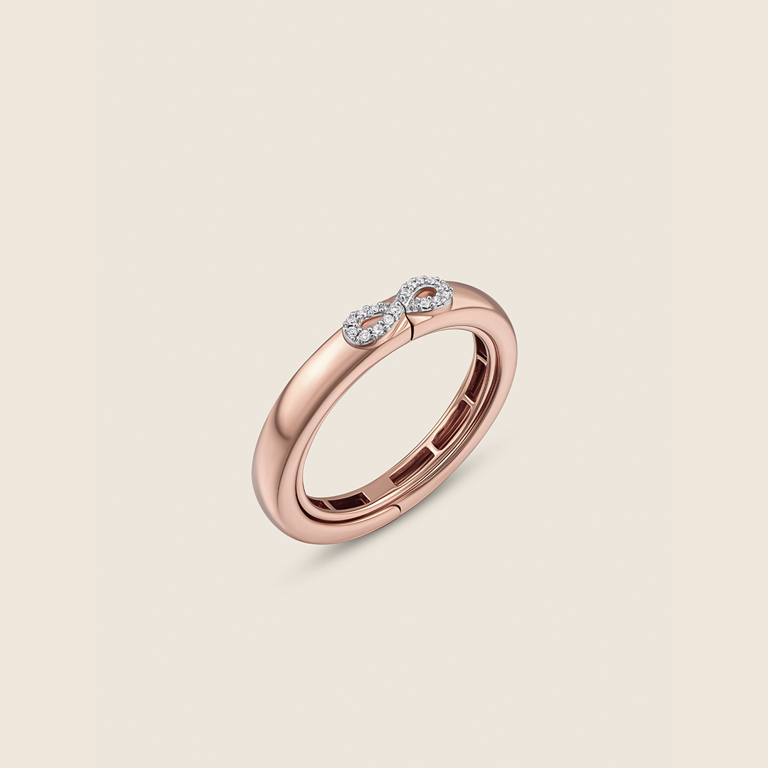 A rose gold band glimmers with a diamond infinity, concealing a whispered secret within. Endless and radiant, it celebrates love?s quiet continuity, sparkling softly as a tender reminder of moments meant to be treasured forever.