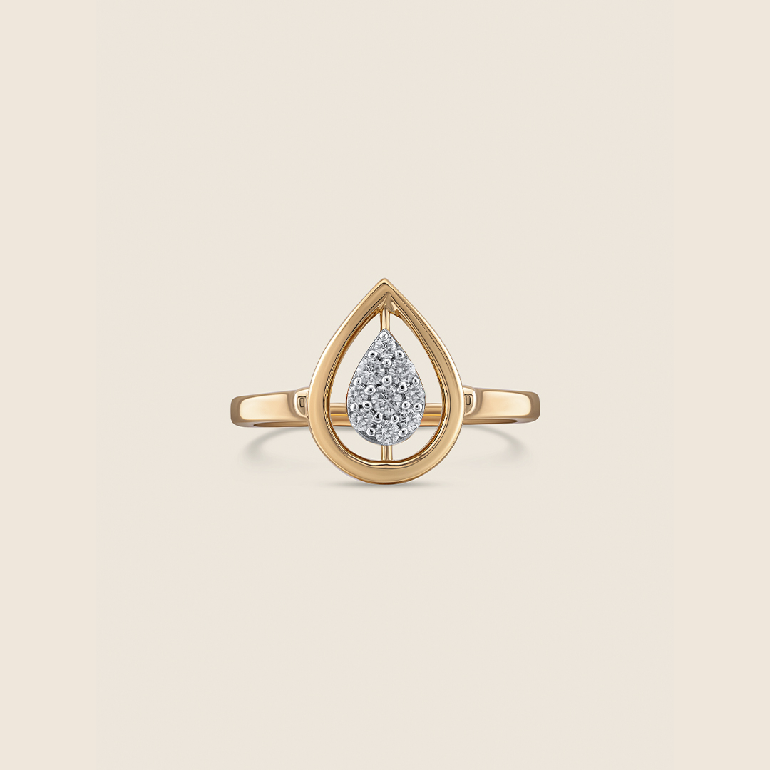 A yellow gold ring holds a gentle drop, one side shimmering with diamonds, the other with emeralds. Ever-shifting, it reflects love?s many moods, capturing quiet moments and the soft sparkle of memories worn close.