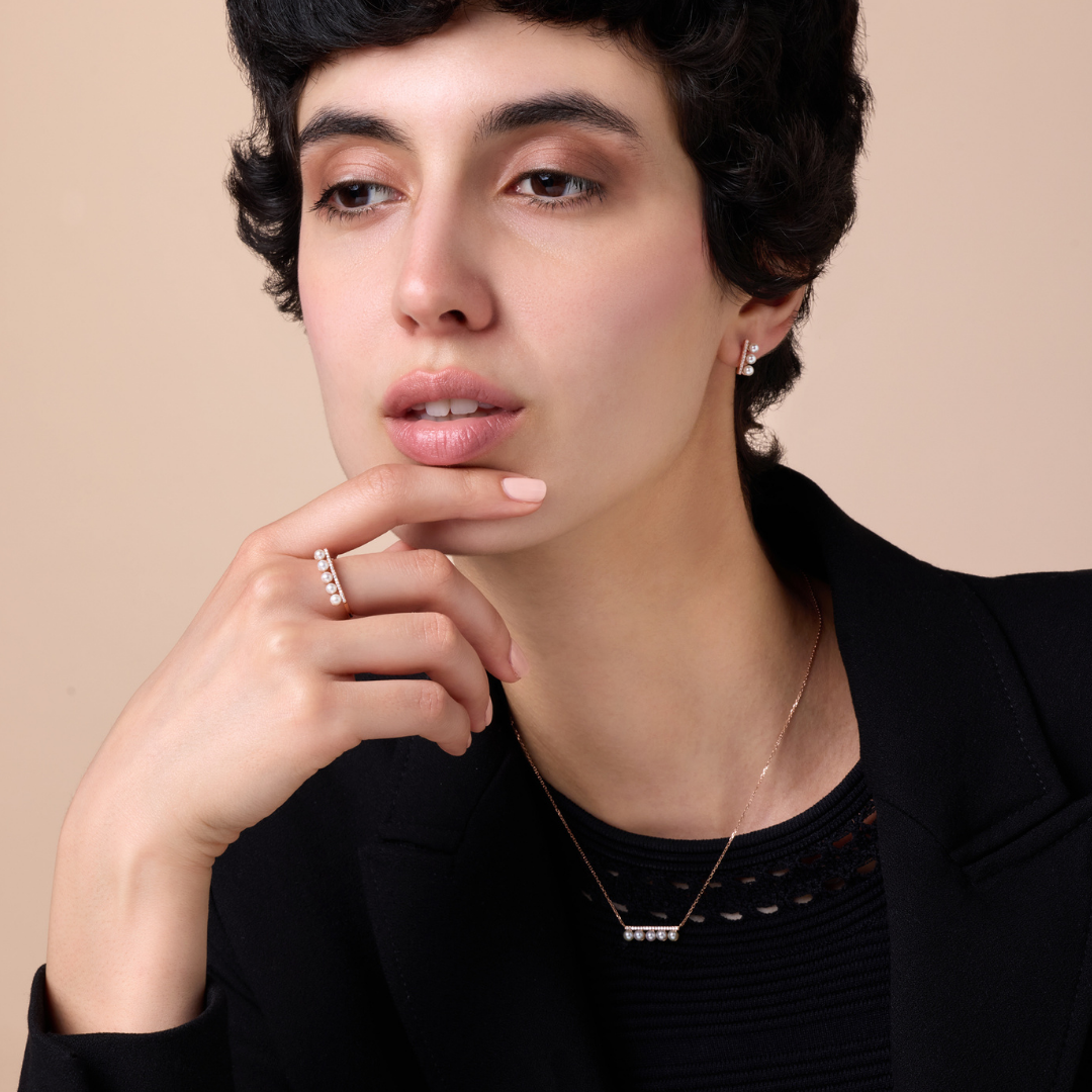 Shimmering with diamonds, a radiant line of rose gold gives way to five dangling pearls, forming an elegant cascade that mirrors the rhythm and grace of flowing waves