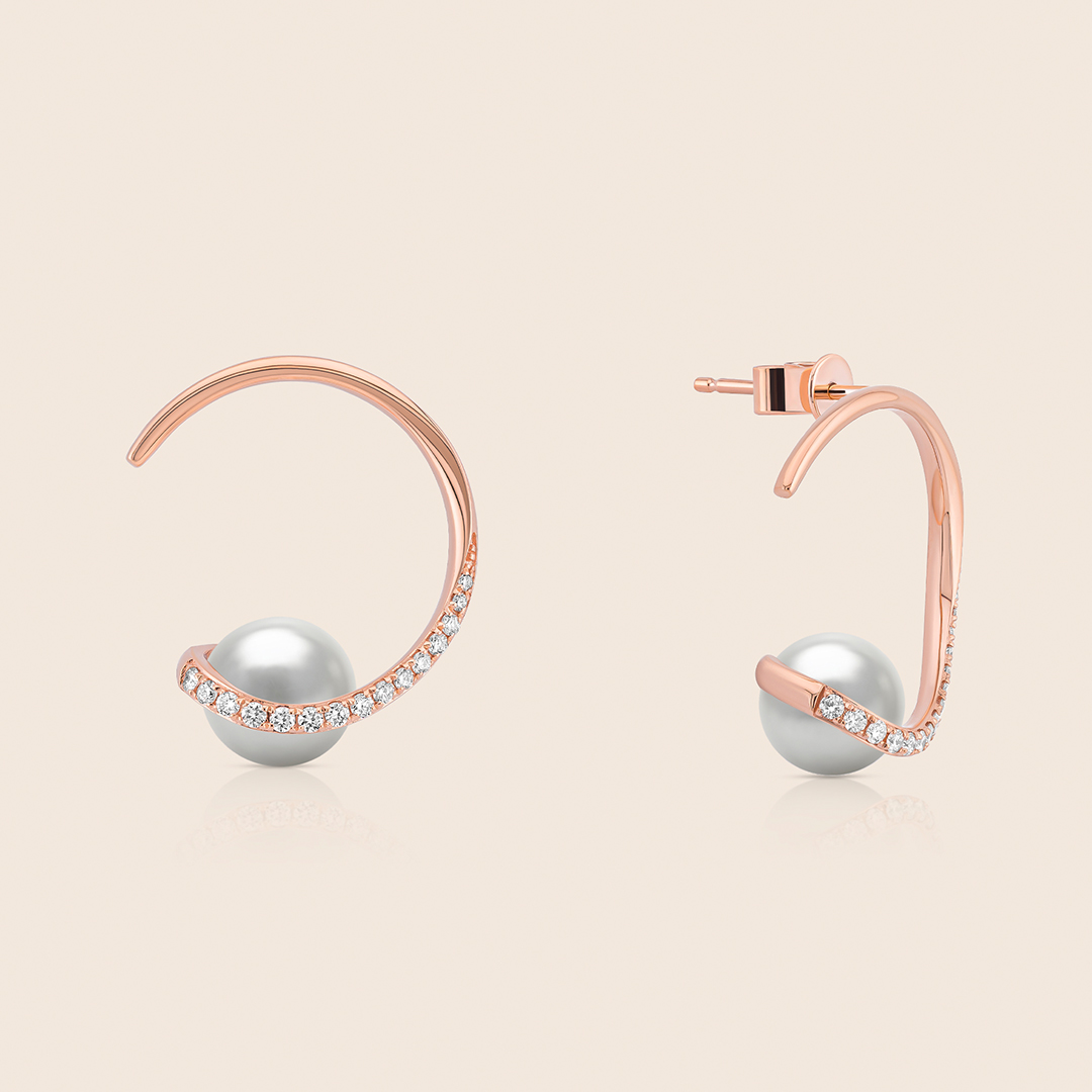 A luminous pearl set in a rose gold crescent adorned with diamonds, symbolizing celestial elegance, feminine grace, and the quiet power of refined beauty.