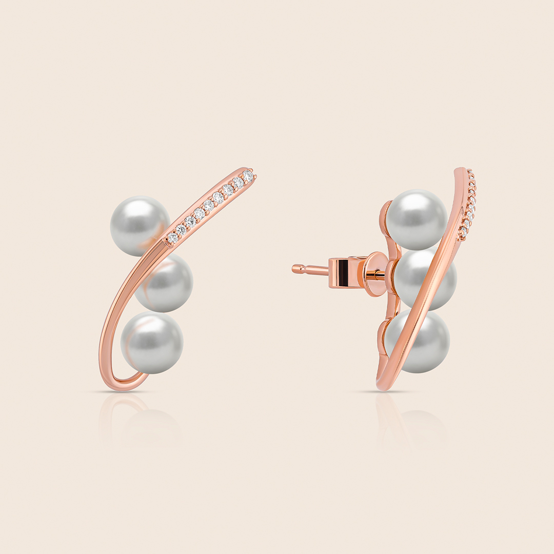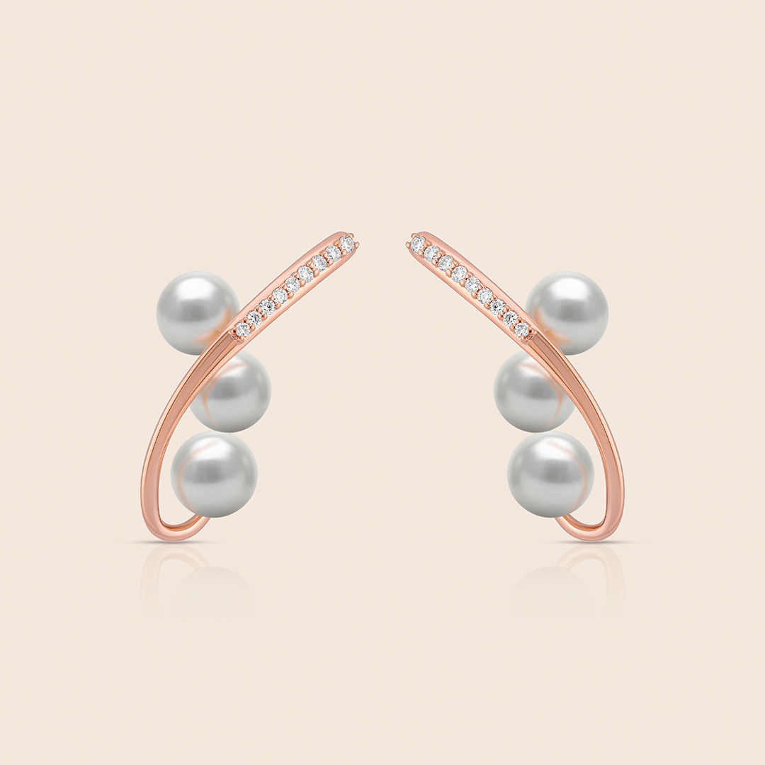 A graceful curve of rose gold lined with diamonds and adorned with three luminous pearls, this earring evokes fluid beauty, balance, and refined elegance.