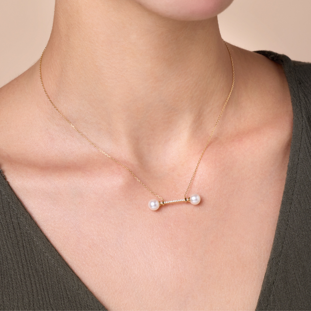 A refined yellow gold balance bar pendant adorned with sparkling diamonds and twin pearls, symbolizing equilibrium, contemporary grace, and timeless sophistication.