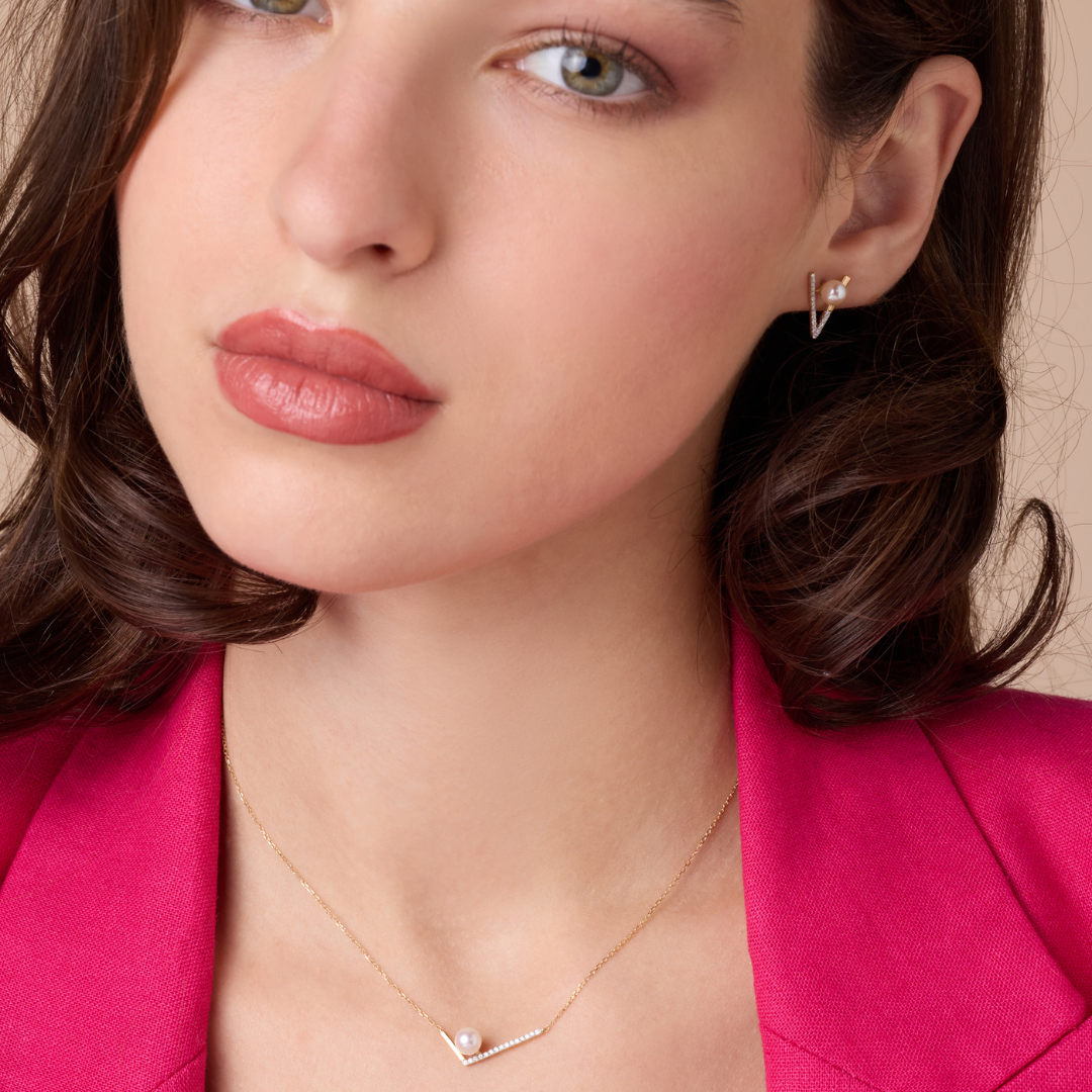 A striking geometric V pendant in yellow gold, adorned with sparkling diamonds and a luminous center pearl, symbolizing strength, elegance, and contemporary beauty.
