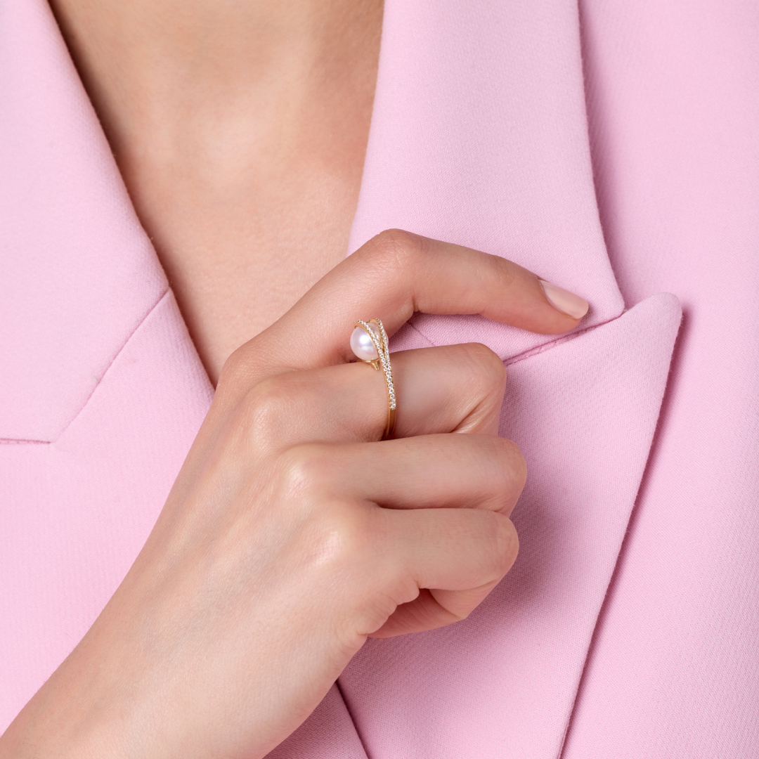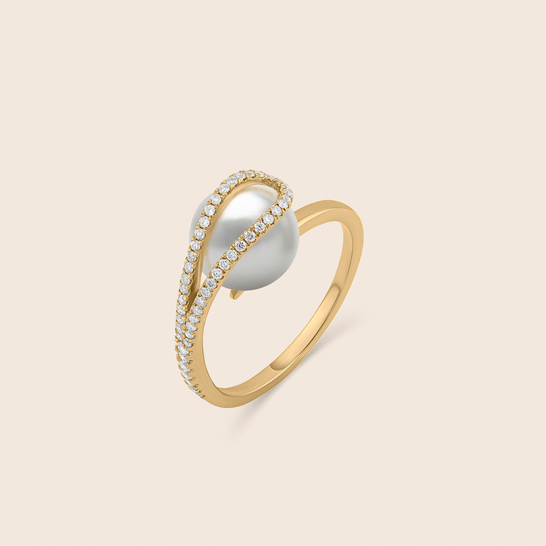 lavita yellow gold diamond tower ring with center pearl