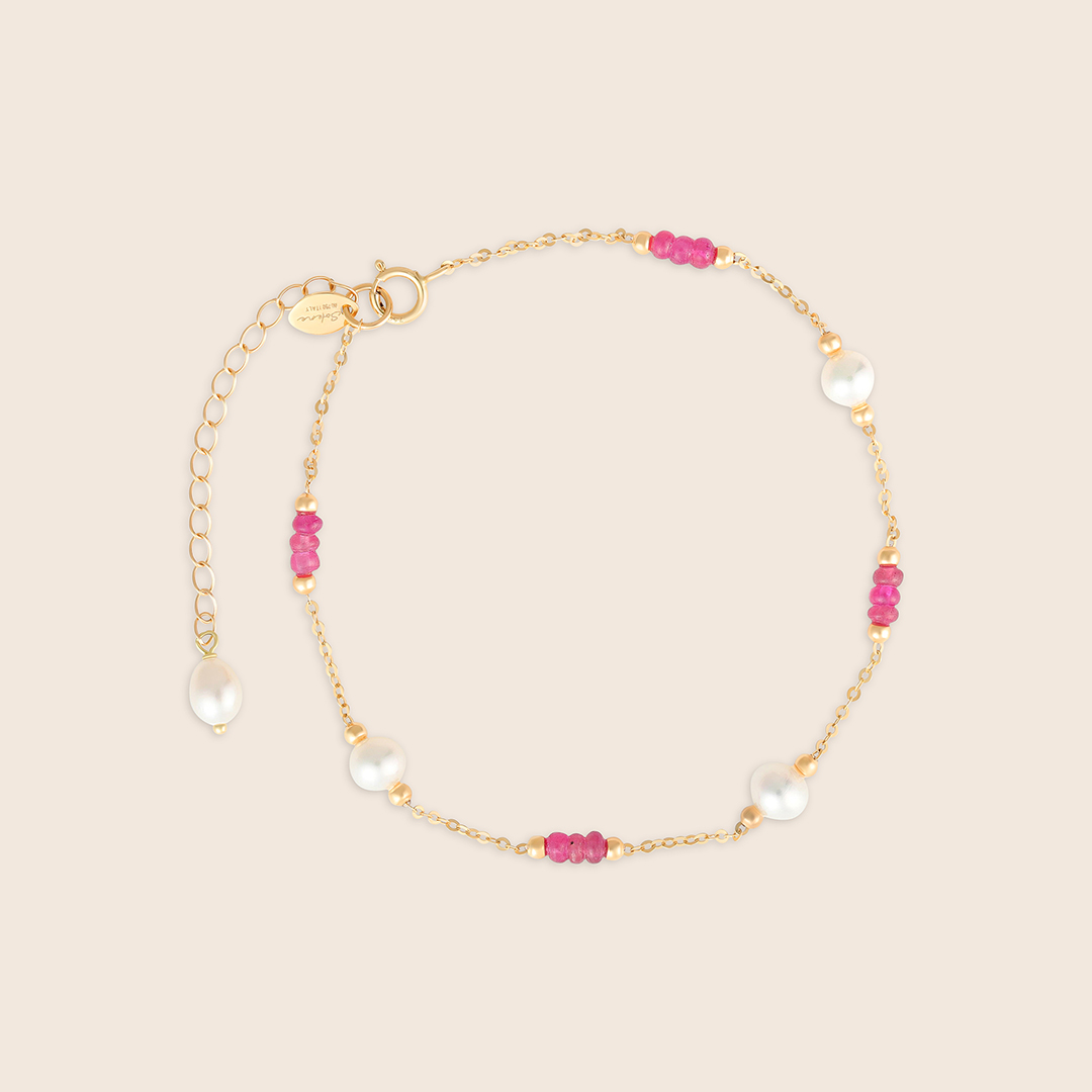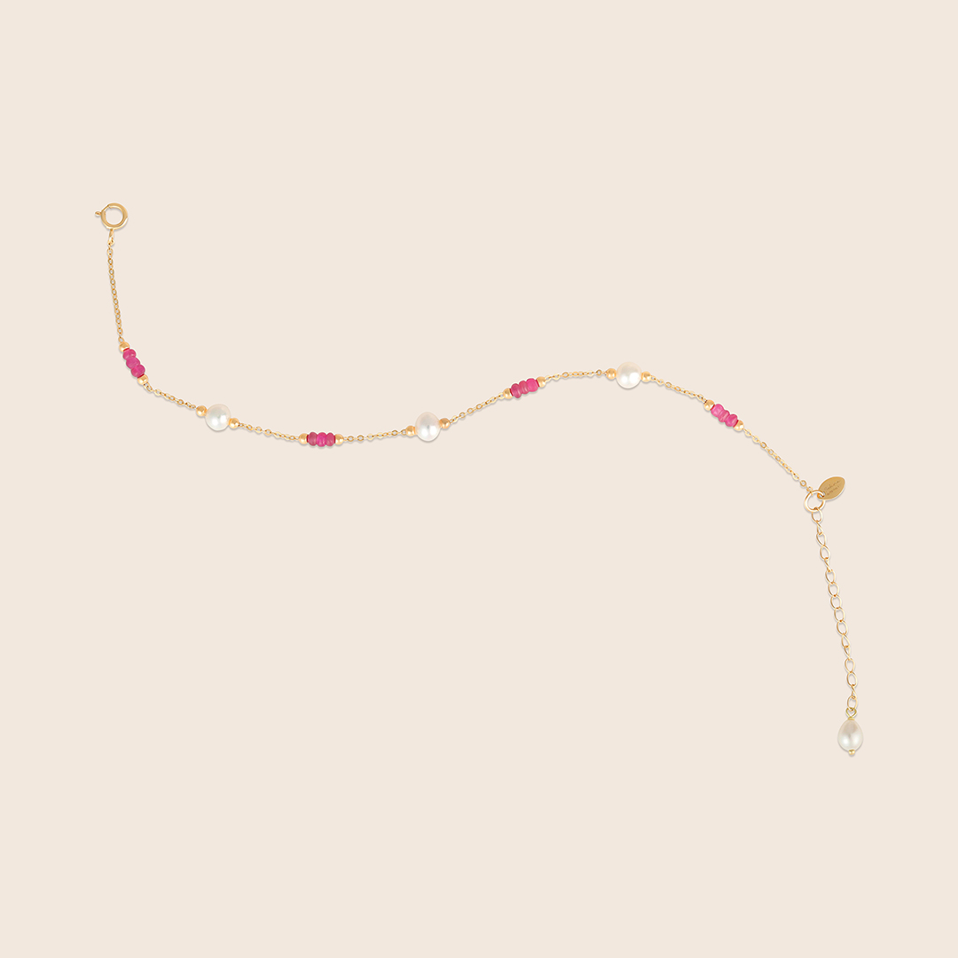Lavita yellow gold pearl bracelet with two consecutive ruby beads