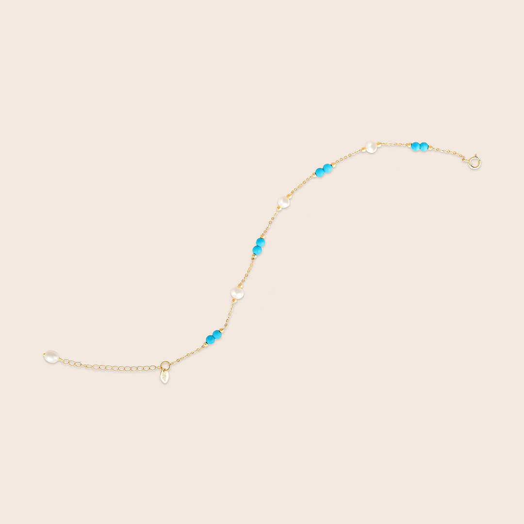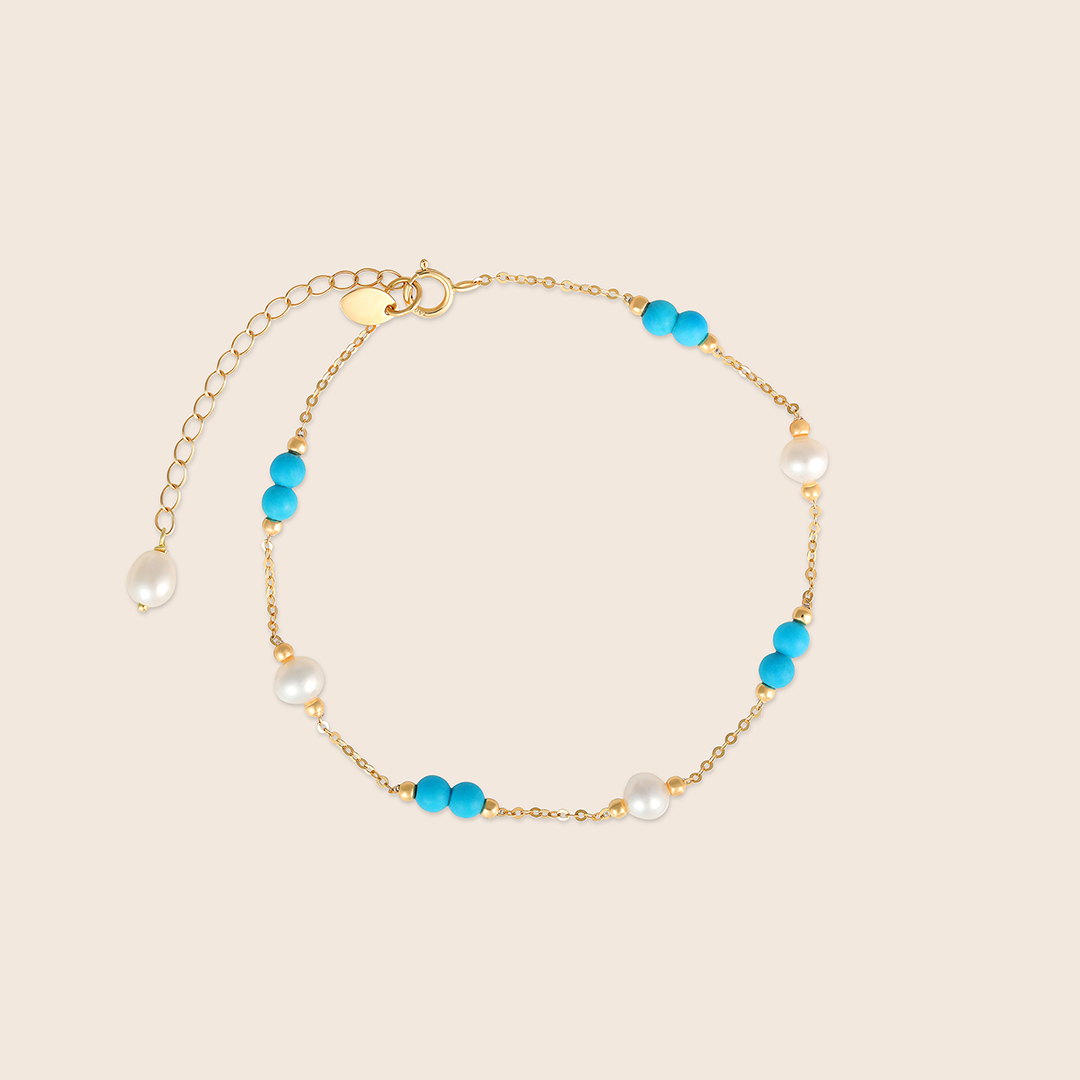 Lavita yellow gold pearl bracelet with two consecutive turquoise beads