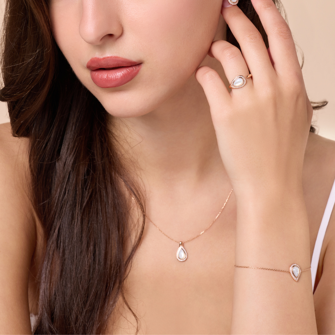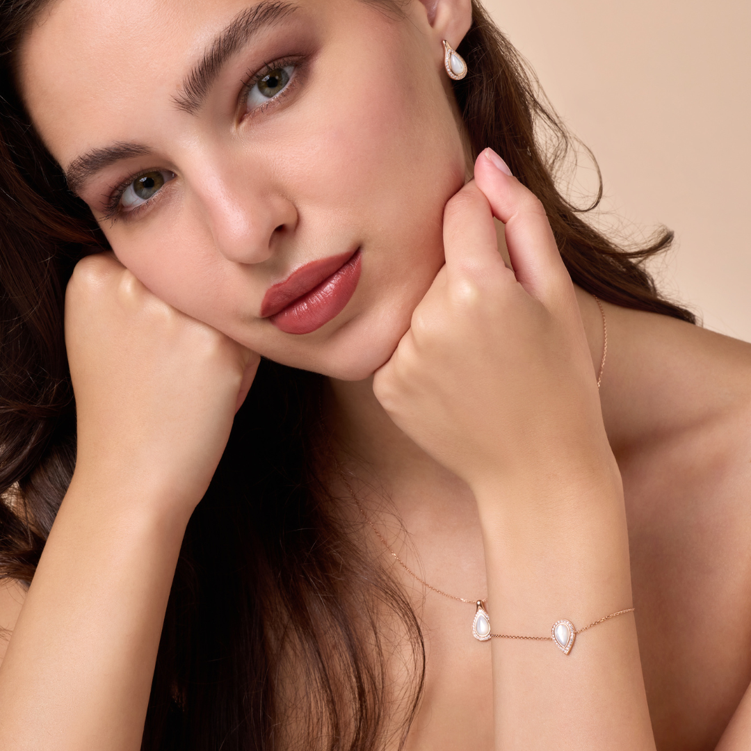 Delicate mother of pearl drops shimmer alongside diamonds in rose gold evoking softness, grace, and the ethereal beauty of a gentle, flowing elegance.