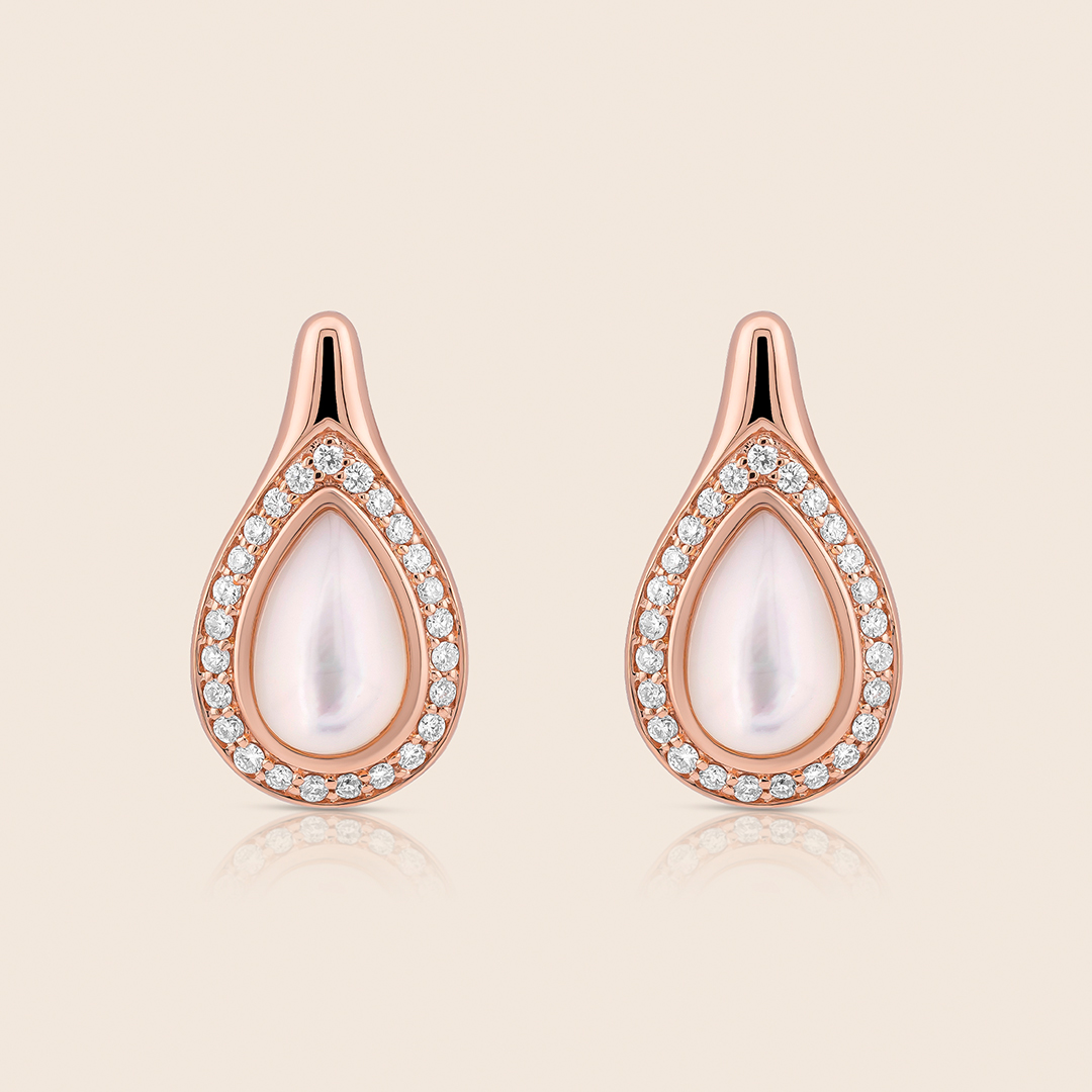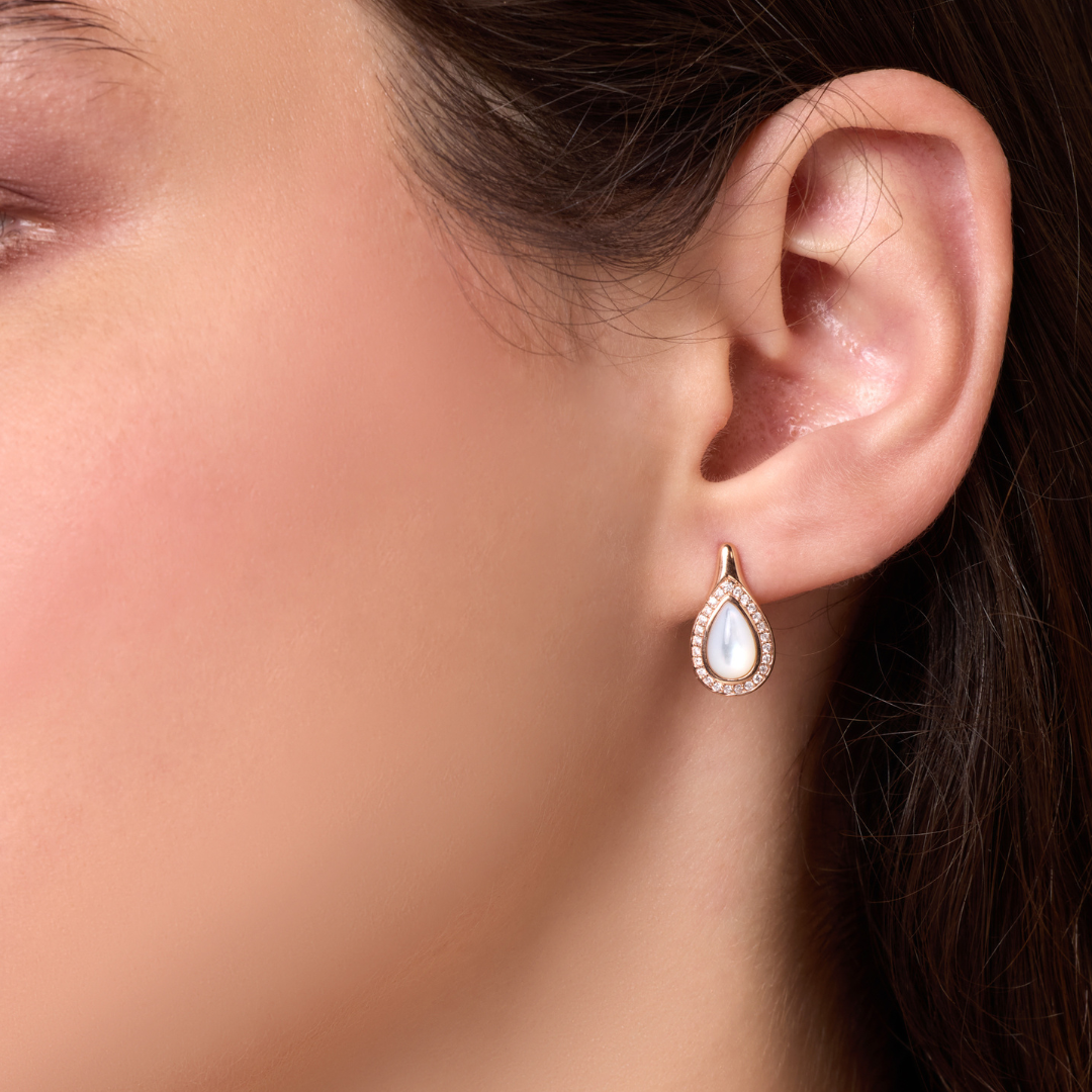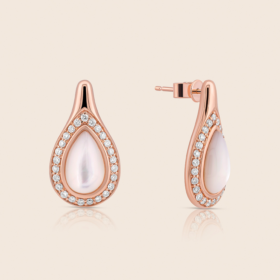 Mother of pearl drops sway beneath sparkling diamonds in rose gold capturing delicate movement, luminous charm, and the serene beauty of refined femininity.