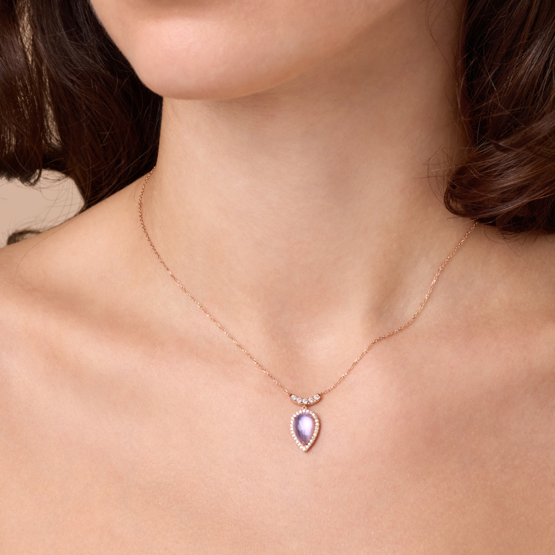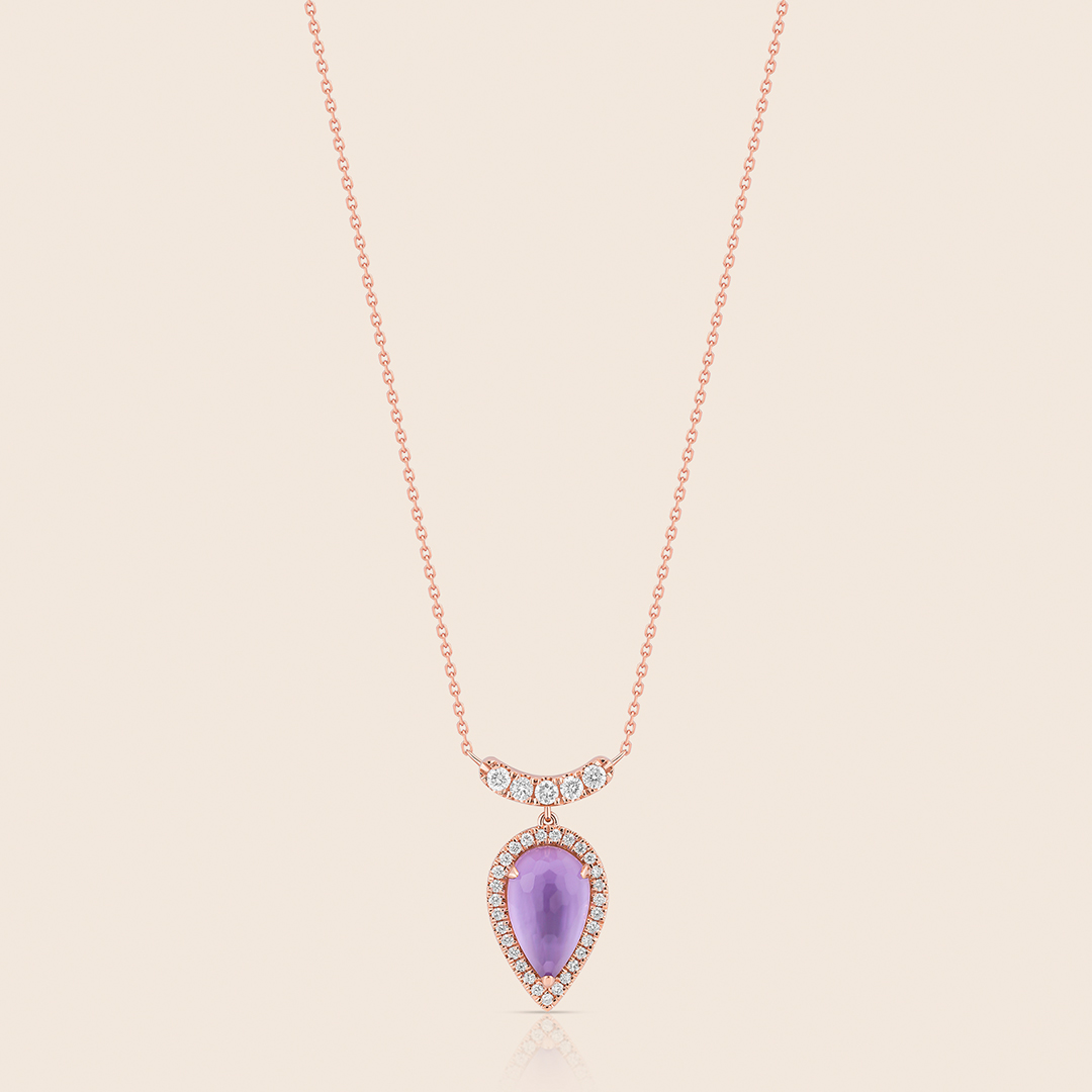 An amethyst raindrop is embraced by rose gold and accented with a flowing curve of diamonds, where elegance, harmony, and the timeless beauty of the spirit are reflected