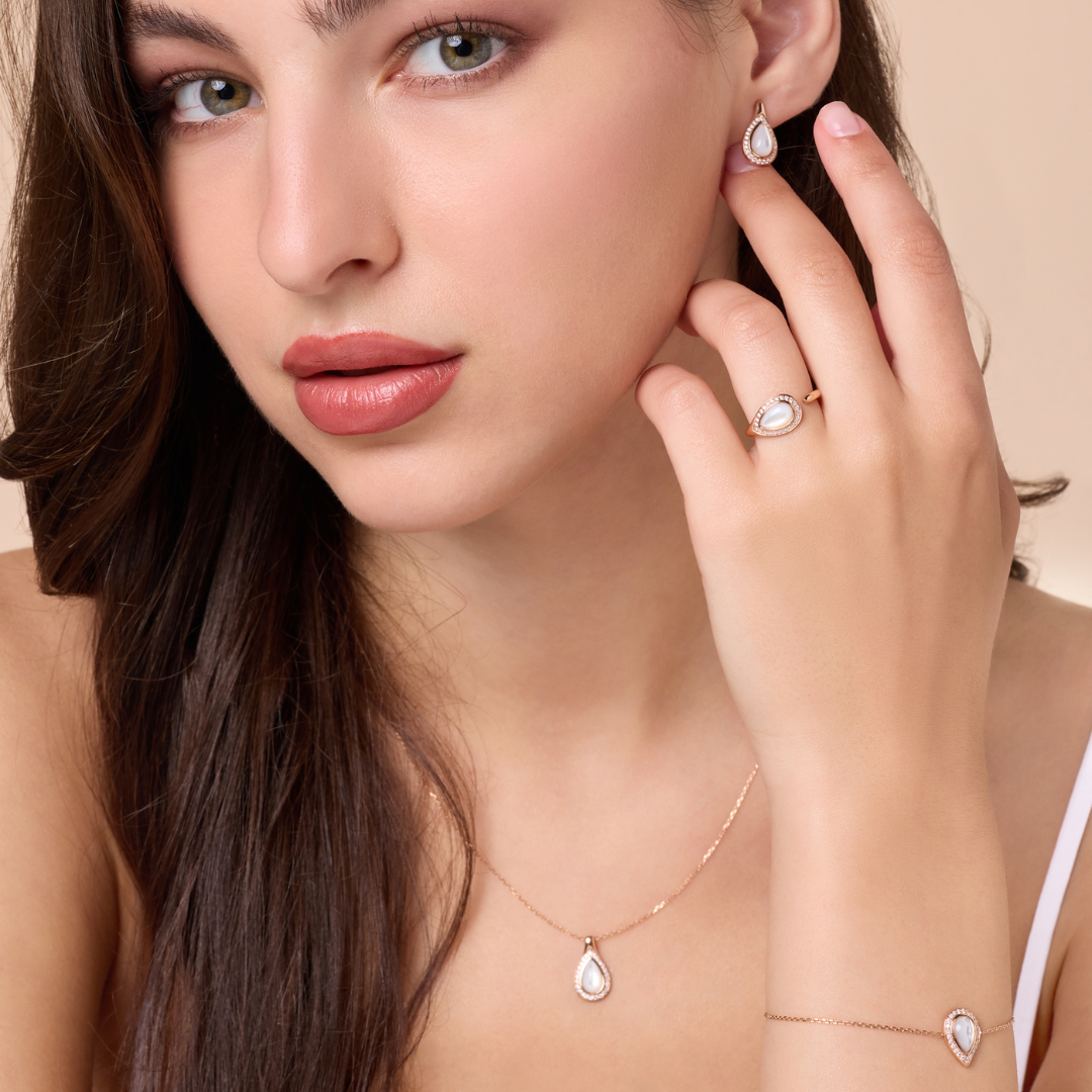 Soft mother of pearl drops accent radiant diamonds in rose gold blending fluid grace, feminine charm, and the delicate beauty of celestial light.