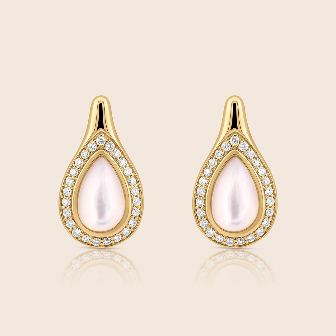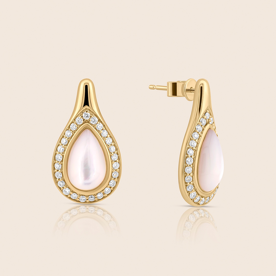 Mother of pearl drops glow beneath sparkling diamonds in yellow gold reflecting warmth, serenity, and the timeless elegance of natural beauty.