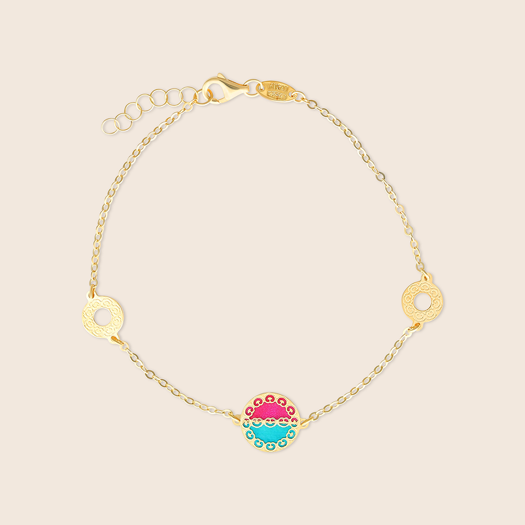 Encased in a golden form, vibrant semi precious stones are set within a delicately detailed border, with color and radiance reflecting elegance, artistry, and the brilliance of individuality