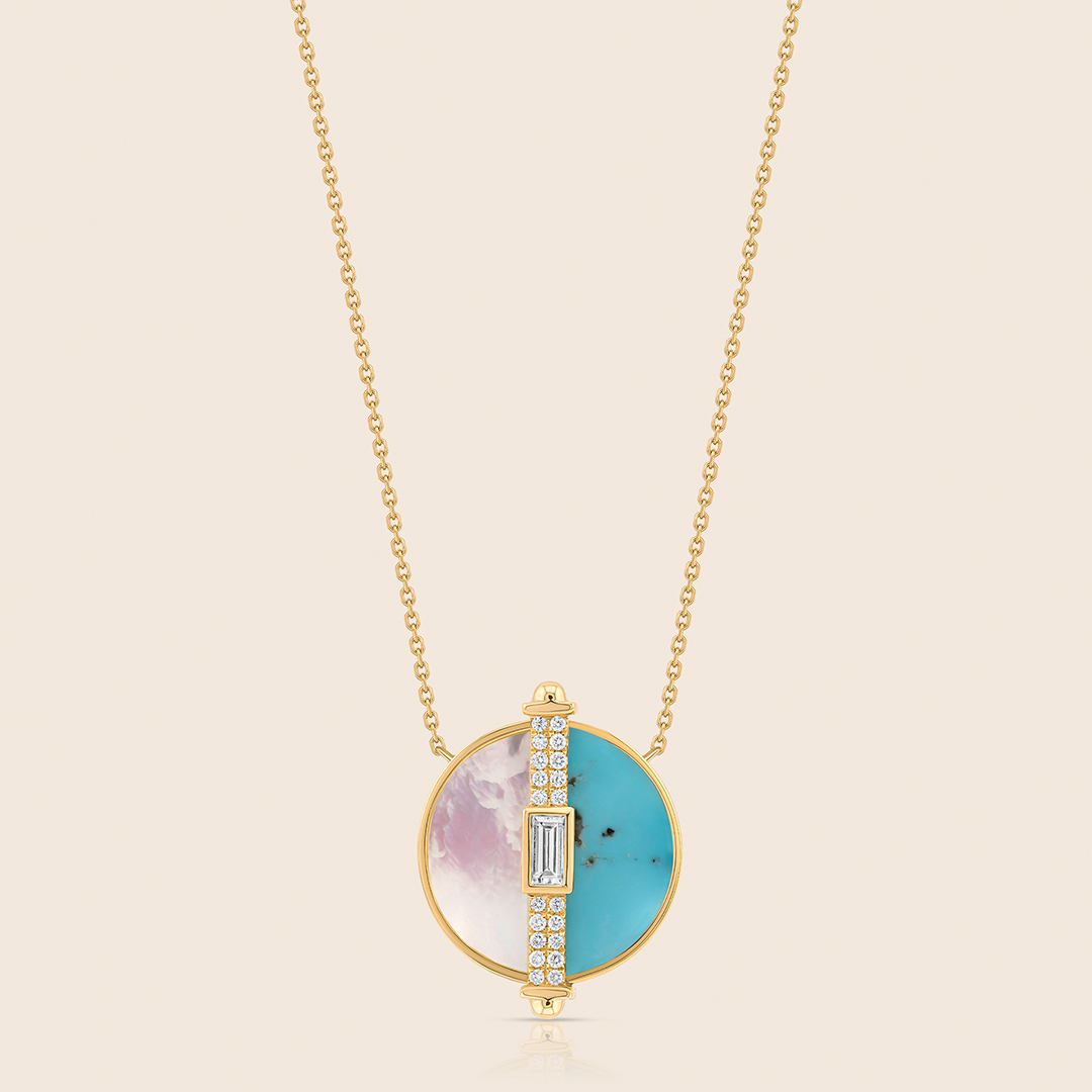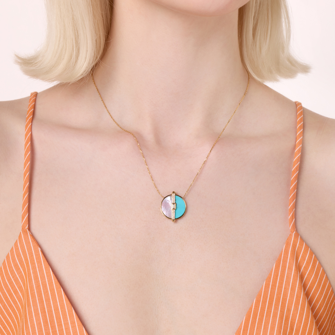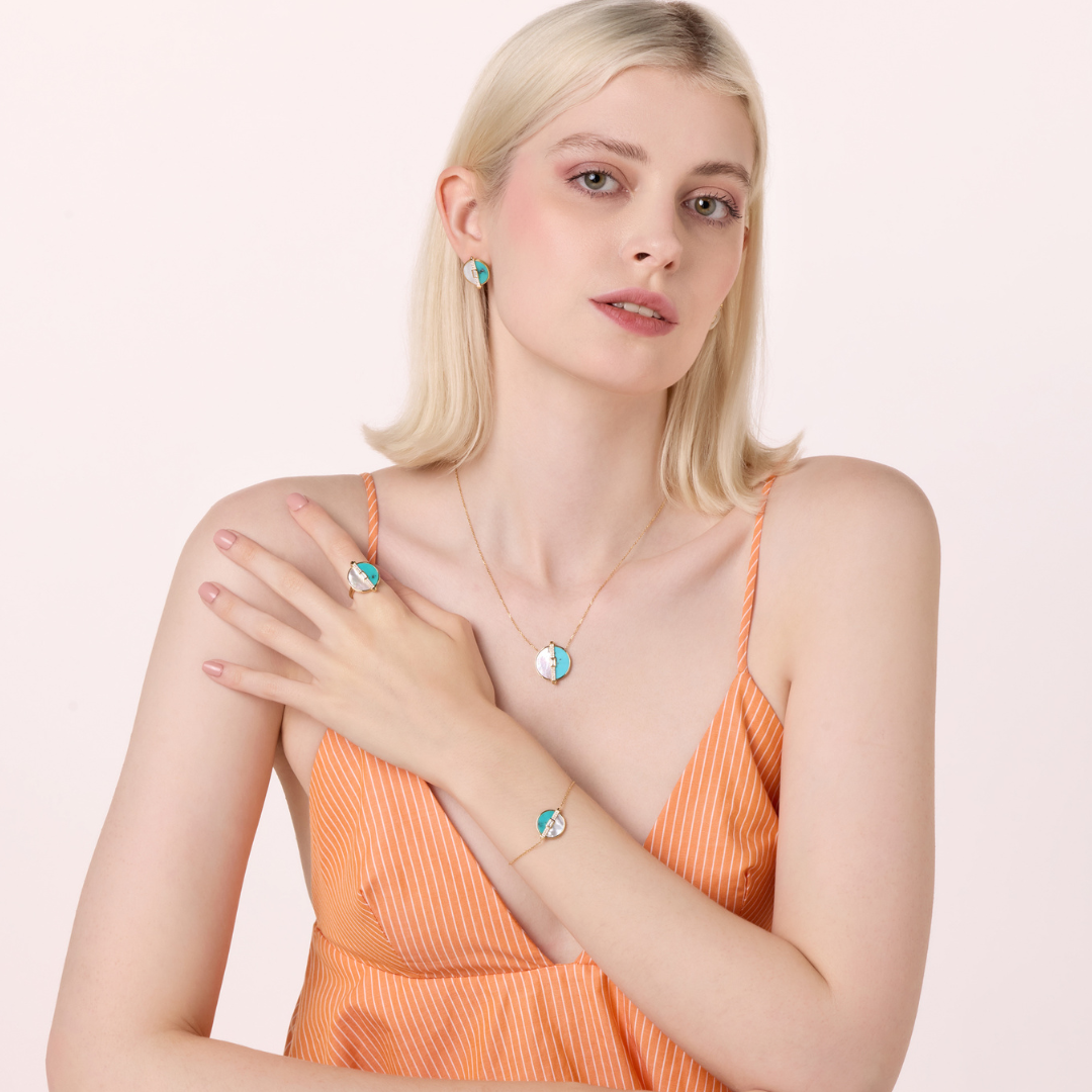 Turquoise and mother of pearl set in yellow gold, accented with diamonds celebrating balance, serenity, and the luminous charm of natural elegance.
