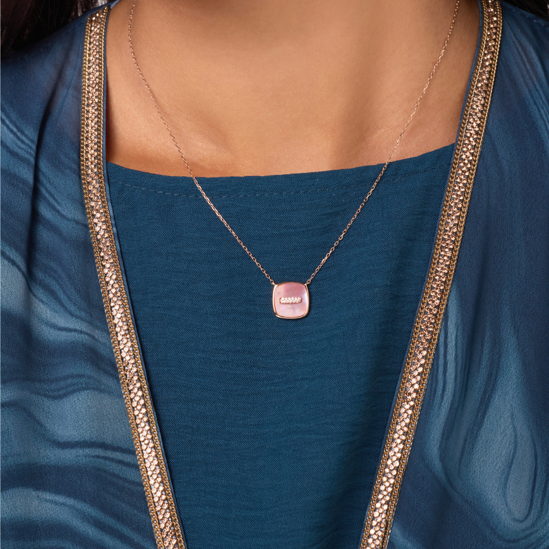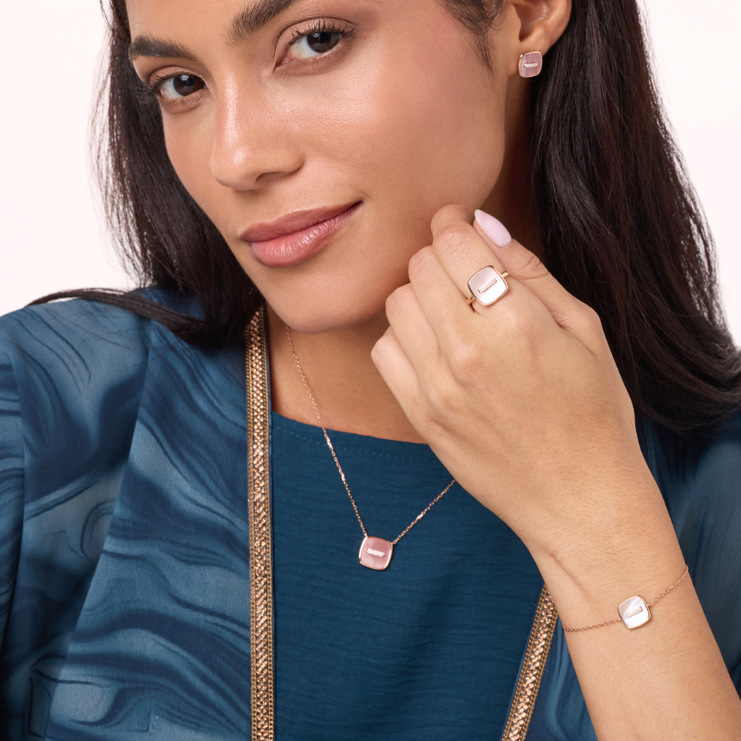 Luminous mother of pearl is set within a golden cushion and adorned with sparkling diamonds, where subtle geometry and radiant elegance are brought together to celebrate purity, light, and individuality